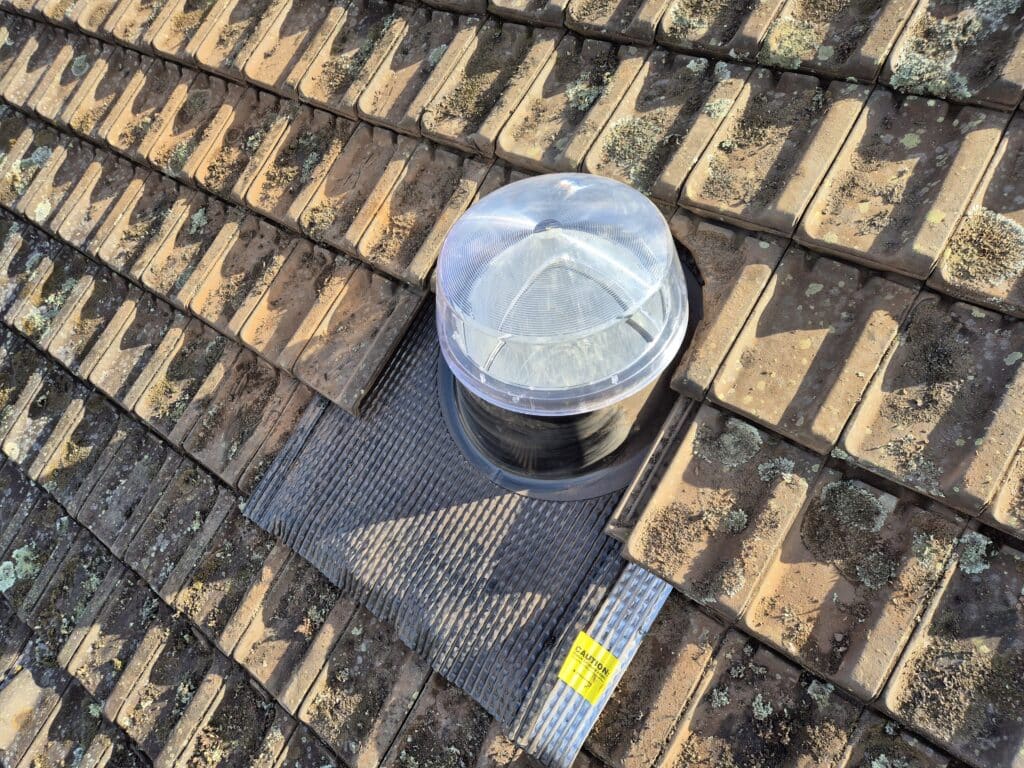 À l’intérieur, le diffuseur s’intègre parfaitement au plafond, comme un luminaire naturel. À l’extérieur, le capteur reste discret sur la toiture.
